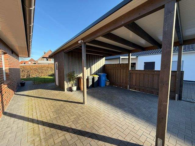Ein Carport mit integriertem Geräteraum rundet das attraktive Angebot ab und bietet sowohl einen geschützten Stellplatz als auch zusätzlichen Stauraum.