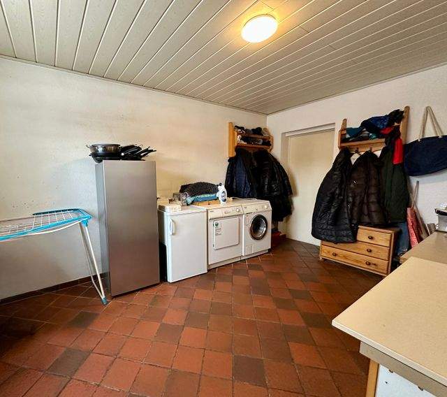 Über eine Treppe gelangen Sie ins Obergeschoss, wo sich vier Schlafzimmer und zwei Bäder befinden – ideal für Familien, Mitarbeitende oder zur Kombination aus Wohnen und Arbeiten. Von einem Schlafzimmer gelangt man auf einen großzügigen Balkon. Das Haus