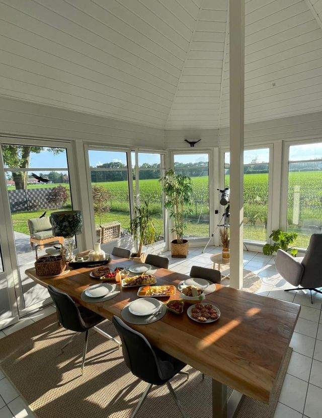 Das Herzstück des Hauses ist das großzügige Wohnzimmer mit Zugang zur sonnigen Terrasse. Ein besonderes Highlight ist der lichtdurchflutete Wintergarten aus dem Jahr 1997, der einen traumhaften Blick über die angrenzenden Felder erö?net und auch in den kühleren Monaten einen gemütlichen Rückzugsort bietet. Die Terrasse selbst wurde nachträglich vergrößert und mit hochwertigen neuen Fliesen versehen, sodass Sie hier einen großzügigen und einladenden Außenbereich genießen können.