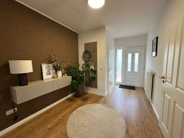 Beim Betreten des Hauses empfängt Sie ein großzügiger, heller Flurbereich, von dem aus alle Räume bequem erreichbar sind. Die separate Küche ist mit hochwertigen Ne?- Geräten ausgestattet und bietet ausreichend Platz für einen großen Esstisch. Von hier aus gelangen Sie direkt in den geräumigen Hauswirtschaftsraum, der mit einem