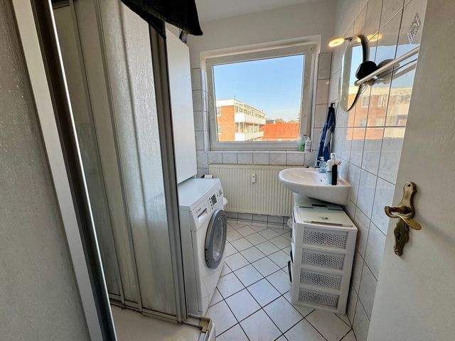Tageslichtbadezimmer mit Waschmaschinenaschluss sowie einen Balkon, der zum